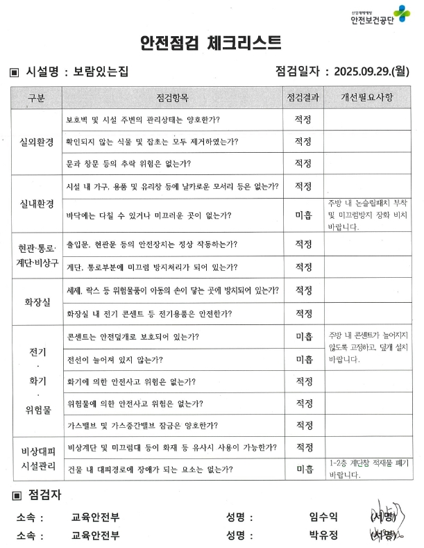 ○ 2025년 핵심역량 나눔활동 (취약계층 안전돌봄) - 일시 : 2025. 9. 29.(월) 09:00~10:00 - 장소 : 보람있는집(장애인보호시설) - 참석자 : 지사장, 교육안전부장, 노조지부장, 박유정 대리, 하창수 대리 ※ 방문기관과 사전 협의 후 진행 - 내용 : 시설물 안전점검 및 안전보건교육기본서(서비스업), OPS배부 등 | |||